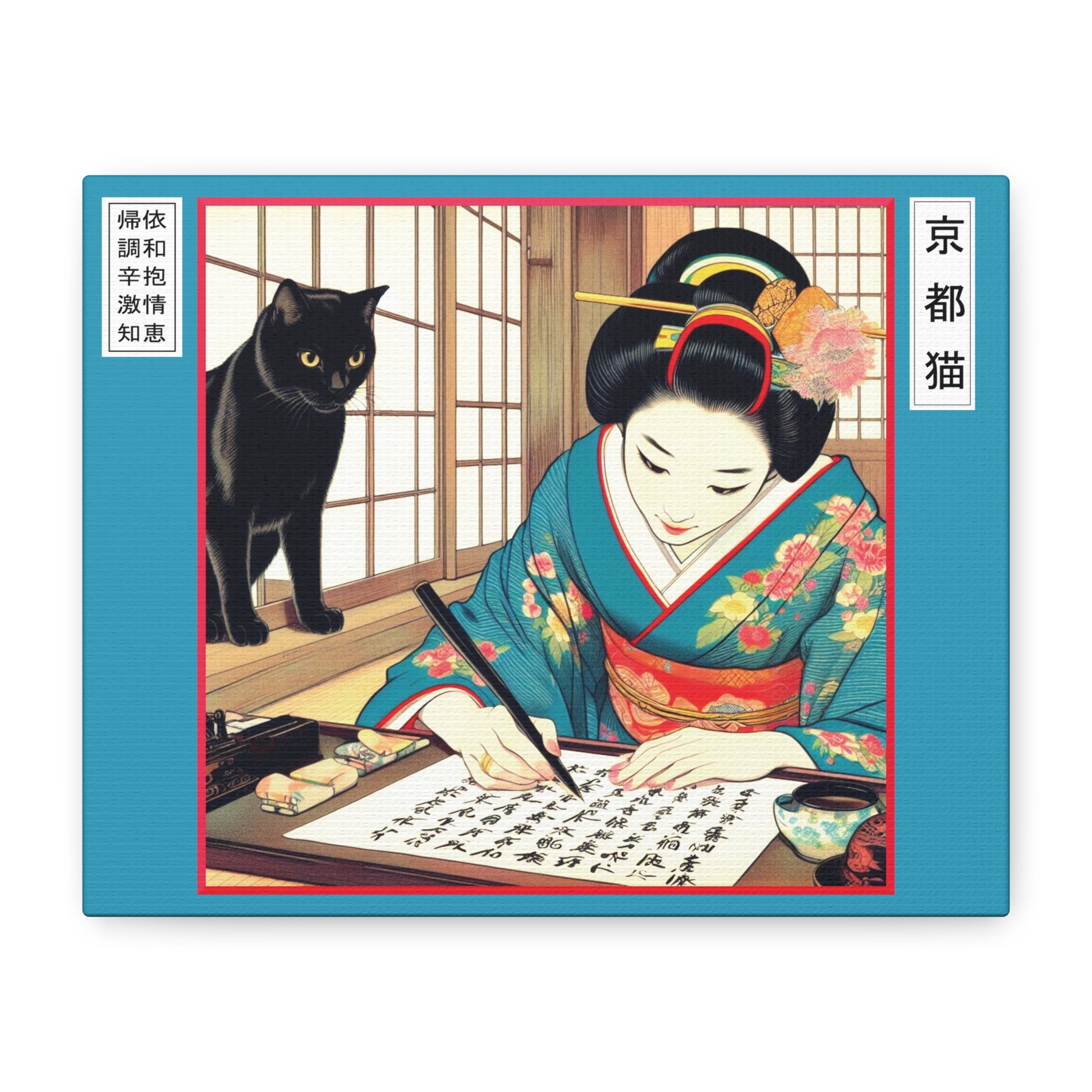 Japanese Geisha Inspired Art Canvas Print, Wall Decor, Gift for Cat Lovers, Asiatic Home Decor, Vintage Style Art, Writer's Inspiration