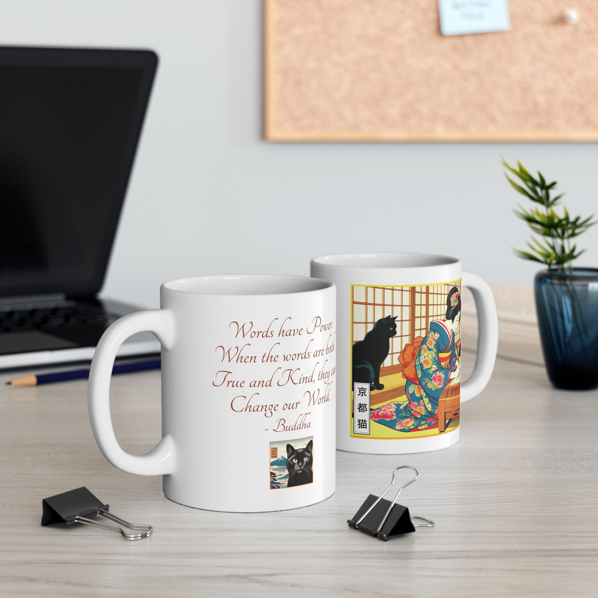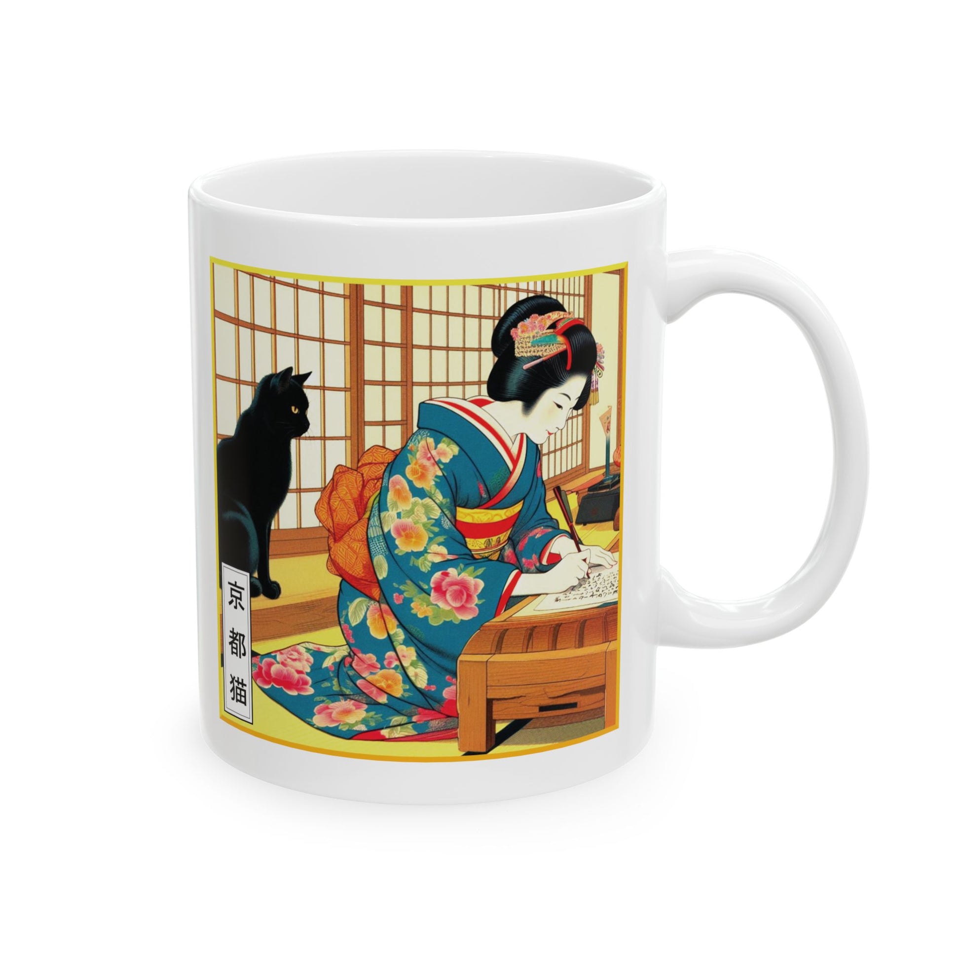 Start your day with a sip of inspiration from our Calligraphy Mugs. Featuring the Kyoto Cat's exploration of this traditional form of Japanese art. Purrfect for coffee or tea lovers, let the elegance and artistry of these mugs elevate your morning routine.