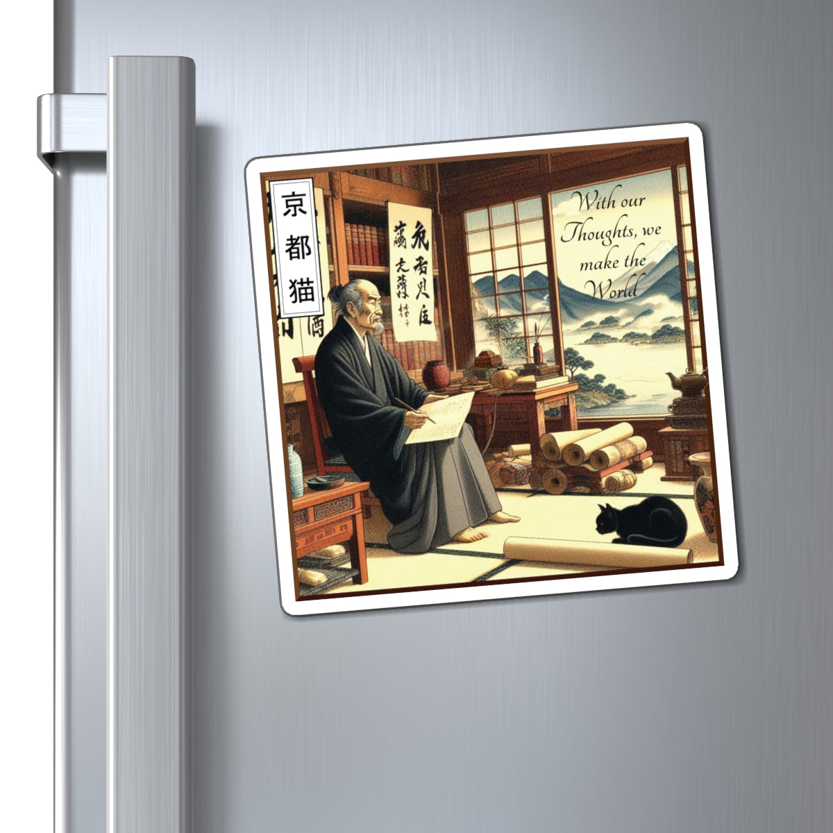Enhance your space with the quiet elegance of the Kyoto Cat, a symbol of wisdom and tranquility. Whether adorning your fridge or workspace, each magnet serves as a reminder of the enduring pursuit of knowledge and the calm that comes with true understanding.
